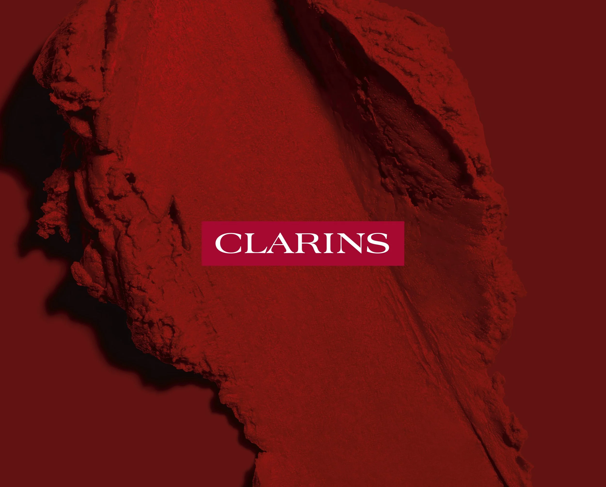 Création de visuels grand format mêlant textures et rouge emblématique de Clarins, pour habiller les façades pendant les travaux des nouvelles boutiques à Paris et à l’étranger